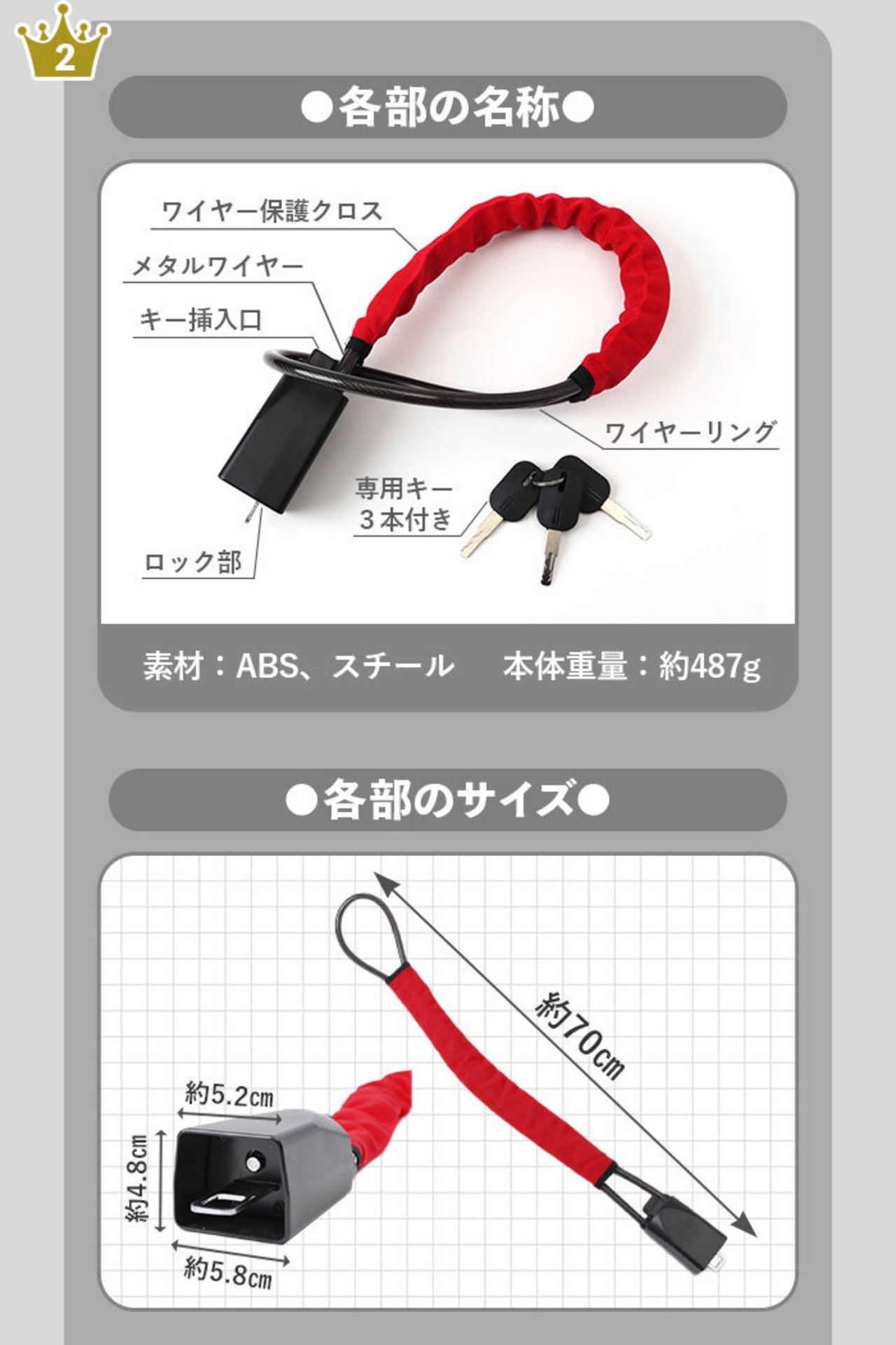・切断に強い頑丈でタフなワイヤーを採用!車の外からでも見える抜群の存在感で盗難抑止効果◎