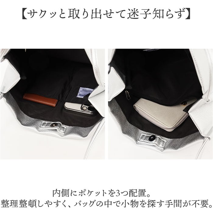 ・内側にポケットを3つ配置。整理整頓しやすく、バッグの中で小物を探す手間が不要。