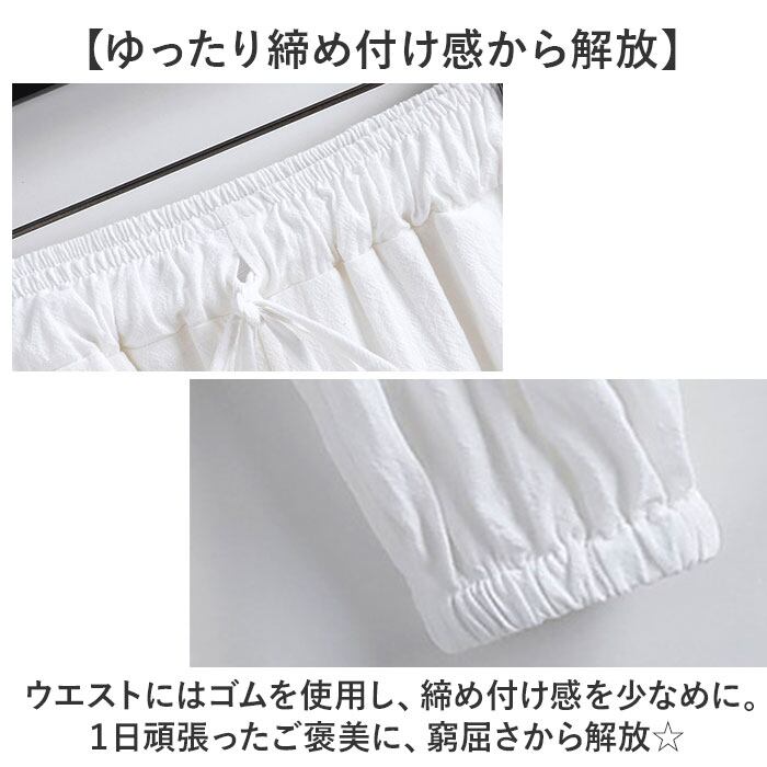 ・ウエストにはゴムを使用し、締め付け感を少なめに。1日頑張ったご褒美に、窮屈さから解放☆