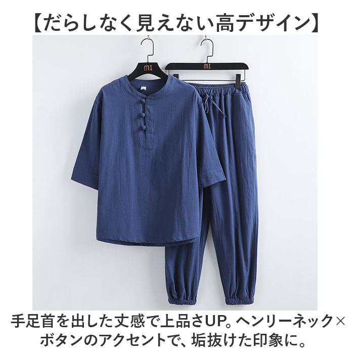 甚平 ロングパンツ ヘンリーネック メンズ 半袖 通販 浴衣 ゆかた じんべい風 甚兵衛 じんべえ風 部屋着 ルームウェア パジャマ 寝巻き 長ズボン ちぢみ ボタン 涼しい シンプル カジュアル 無地 紳士 男性 大人 リラックスウェア リラックス 夏祭り 夏