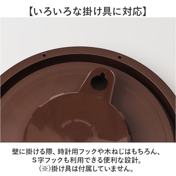 ・壁に掛ける際、時計用フックや木ねじはもちろん、S字フックも利用できる便利な設計。
