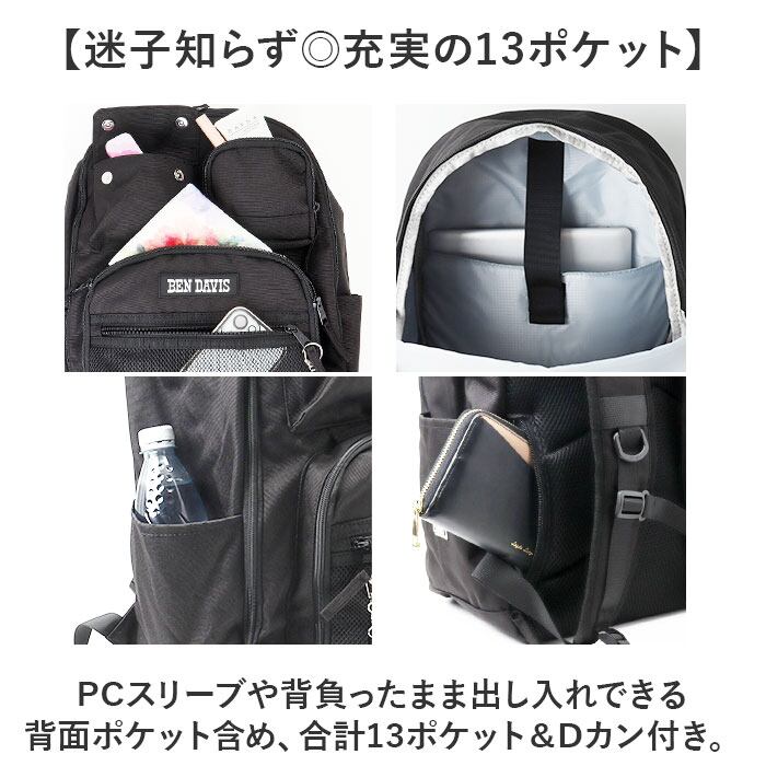・PCスリーブや背負ったまま出し入れできる背面ポケット含め、合計13ポケット&Dカン付き。