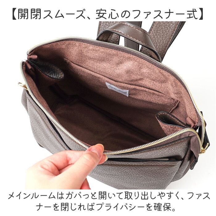 ・メインルームはガバっと開いて取り出しやすく、ファスナーを閉じればプライバシーを確保。