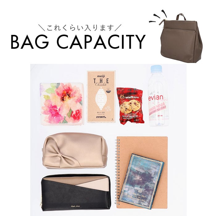・A5や500mlペットボトルがすっぽり。ポーチや長財布なども収納できるサイズ感。