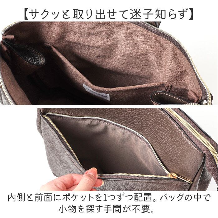 ・内側と前面にポケットを1つずつ配置。バッグの中で小物を探す手間が不要。