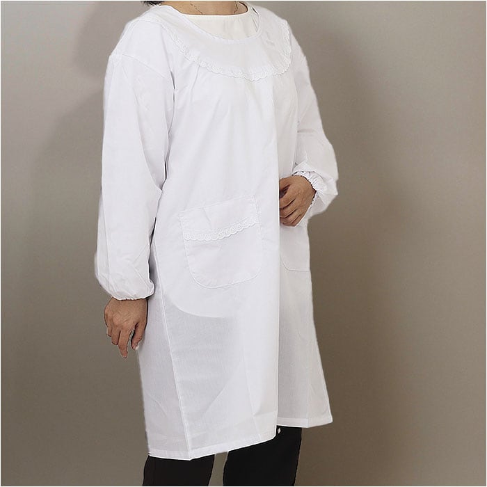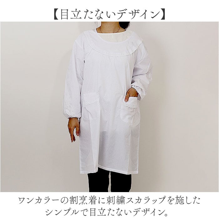 ・ワンカラーの割烹着に刺繍スカラップを施したシンプルで目立たないデザイン。