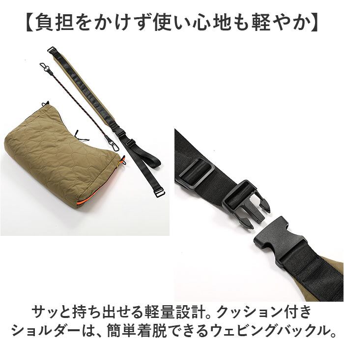 ・サッと持ち出せる軽量設計。クッション付きショルダーは、簡単着脱できるウェビングバックル。