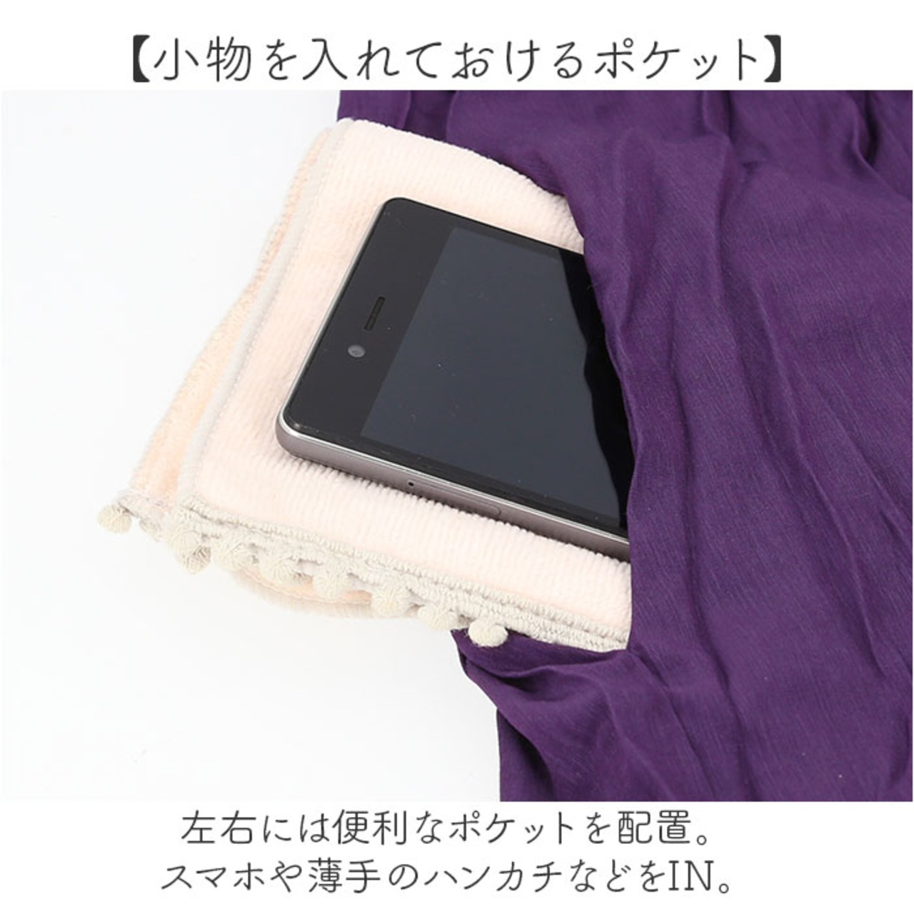 ・左右には便利なポケットを配置。スマホや薄手のハンカチなどをIN。