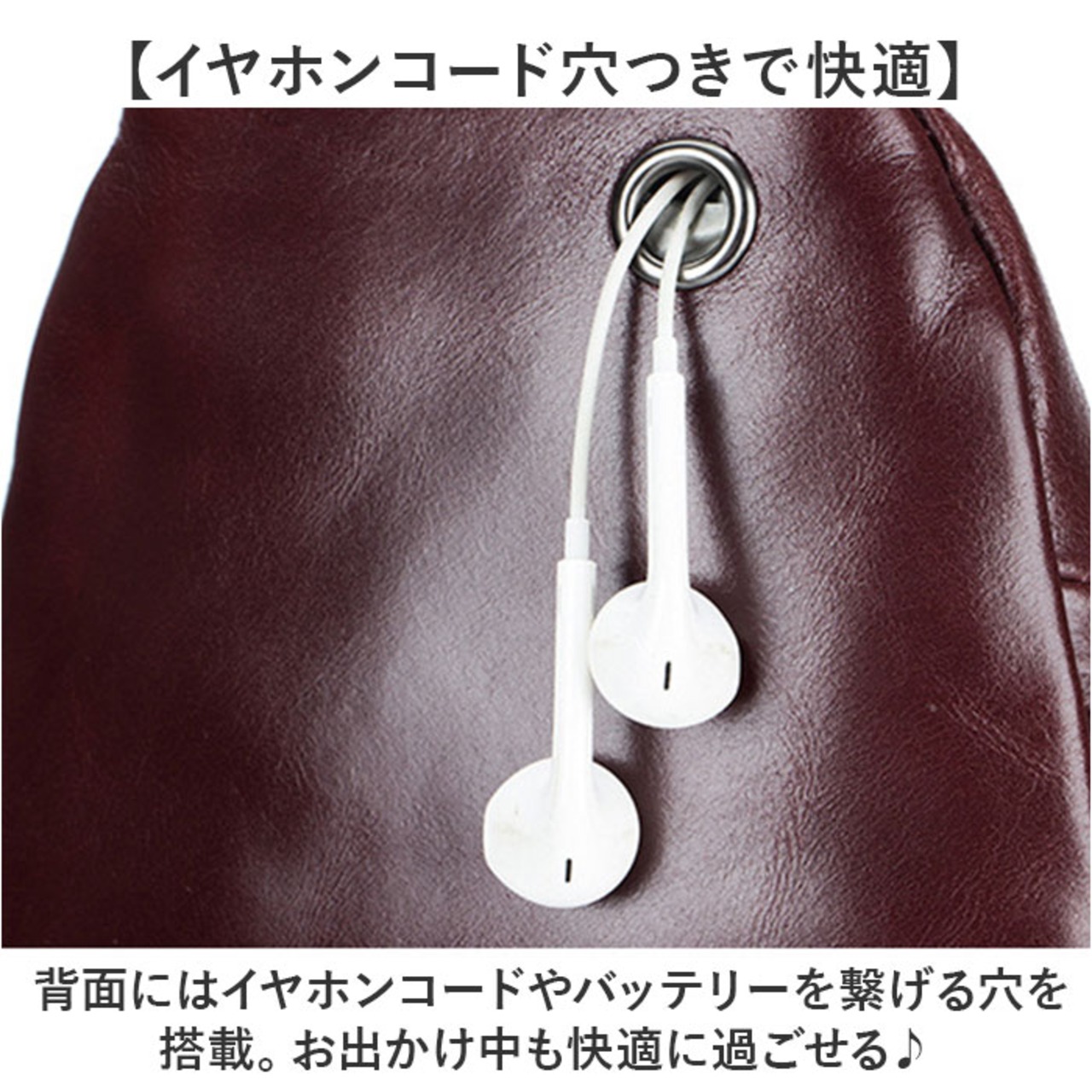 ・背面にはイヤホンコードやバッテリーを繋げる穴を搭載。お出かけ中も快適に過ごせる♪