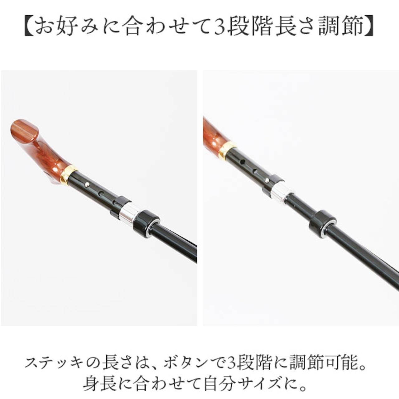 ・ステッキの長さは、ボタンで3段階に調節可能。身長に合わせて自分サイズに。