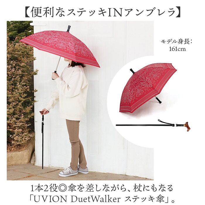 ・1本2役◎傘を差しながら、杖にもなる「UVION DuetWalker ステッキ傘」。