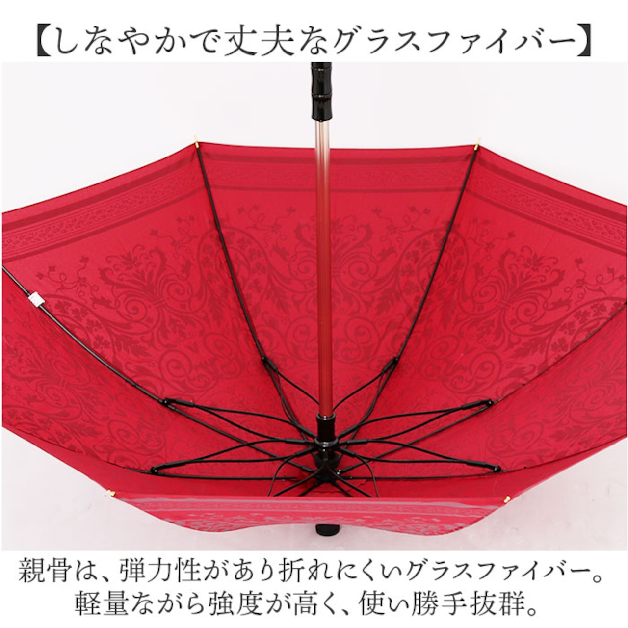 ・親骨は、弾力性があり折れにくいグラスファイバー。軽量ながら強度が高く、使い勝手抜群。