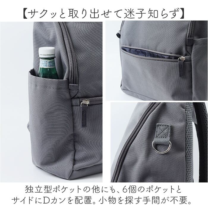 ・独立型ポケットの他にも、6個のポケットとサイドにDカンを配置。小物を探す手間が不要。