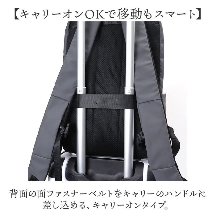 ・背面の面ファスナーベルトをキャリーのハンドルに差し込める、キャリーオンタイプ。