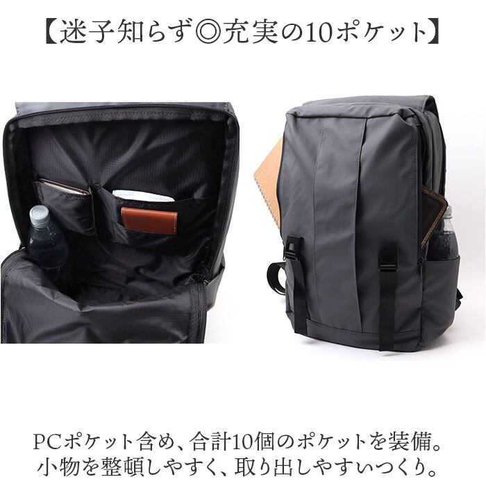 ・PCポケット含め、合計10個のポケットを装備。小物を整頓しやすく、取り出しやすいつくり。