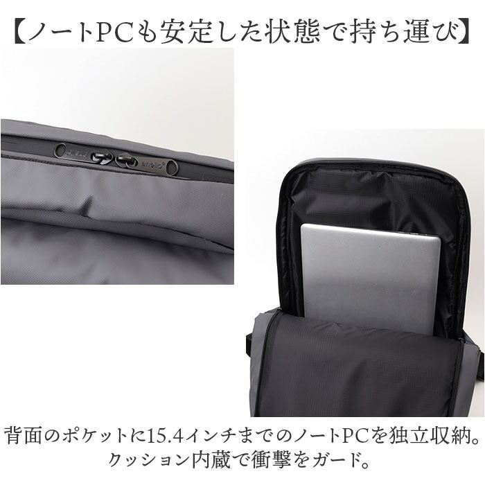 ・背面のポケットに15.4インチまでのノートPCを独立収納。クッション内蔵で衝撃をガード。