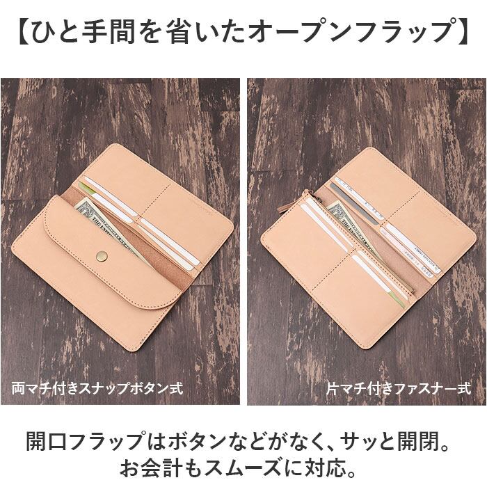 ・両マチ付きスナップボタン式と、片マチ付きファスナー式の2タイプ。出し入れラクラク。