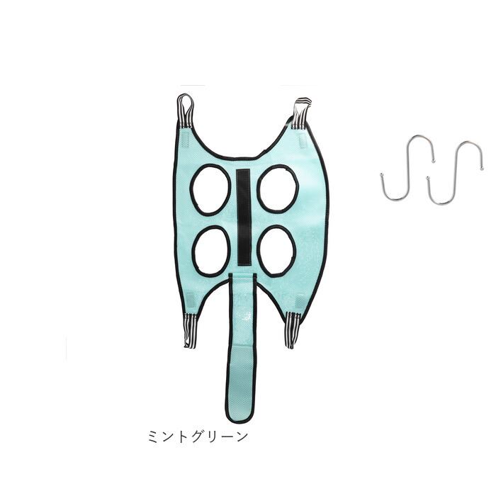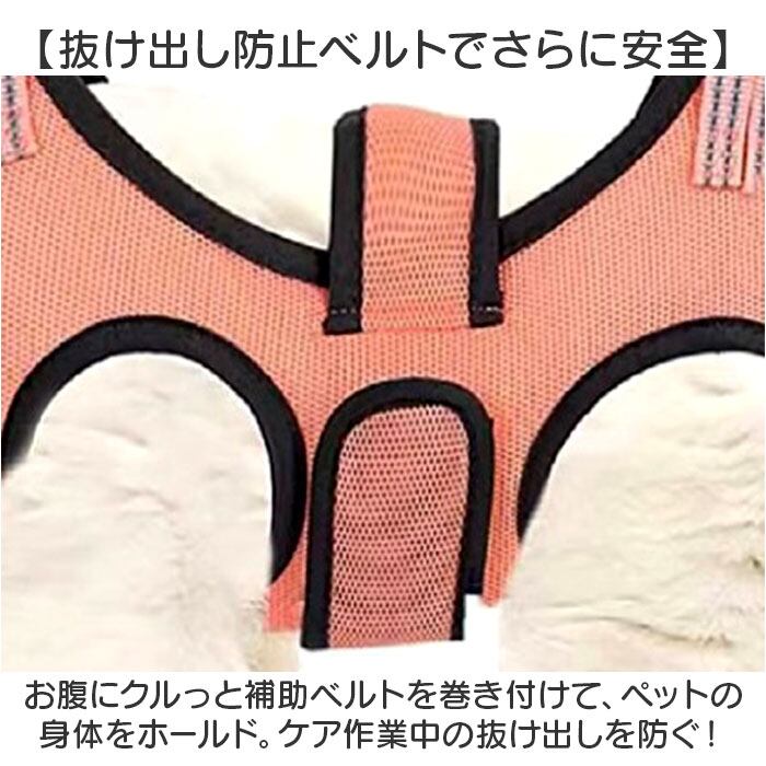 ・お腹にクルっと補助ベルトを巻き付けて、ペットの身体をホールド。ケア作業中の抜け出しを防ぐ!