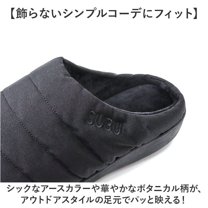 ※シックなアースカラーや華やかなボタニカル柄が、アウトドアスタイルの足元でパッと映える!履き口の「SUBU」のロゴ刺繍が控えめなワンポイント。