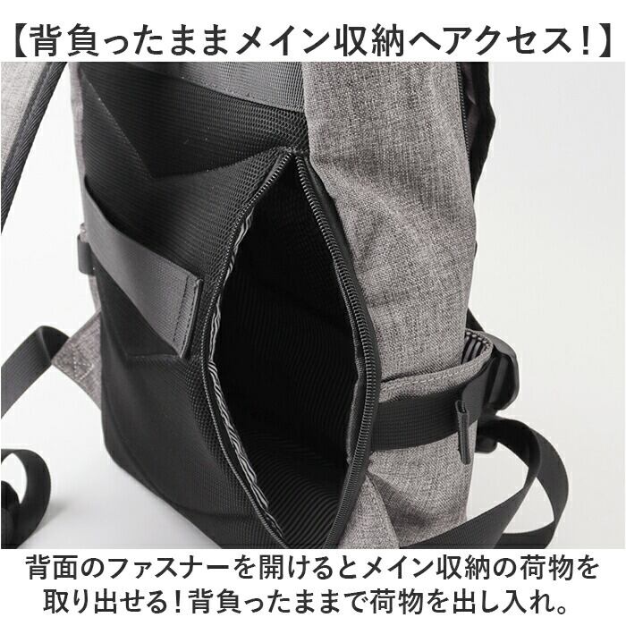 ・背面のファスナーを開けるとメイン収納の荷物を取り出せる!背負ったままで荷物を出し入れ。