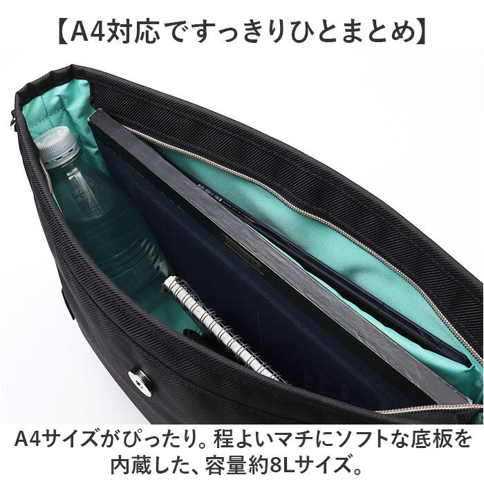 ・A4サイズがぴったり。程よいマチにソフトな底板を内蔵した、容量約8Lサイズ。