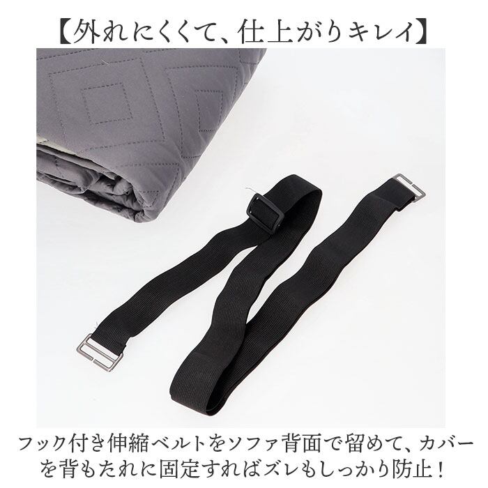 ・フック付き伸縮ベルトをソファ背面で留めて、カバーを背もたれに固定すればズレもしっかり防止!