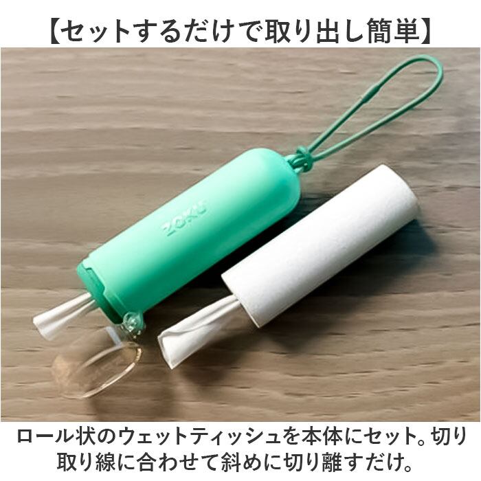 ・ロール状のウェットティッシュを本体にセット。切り取り線に合わせて斜めに切り離すだけ。