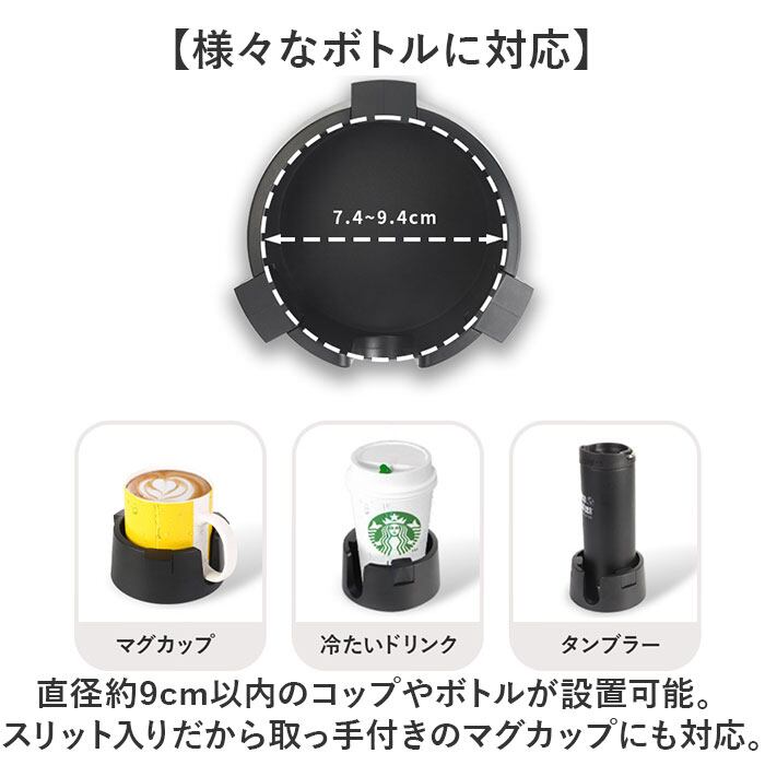 ・直径約9cm以内のコップやボトルが設置可能。スリット入りだから取っ手付きのマグカップにも対応。