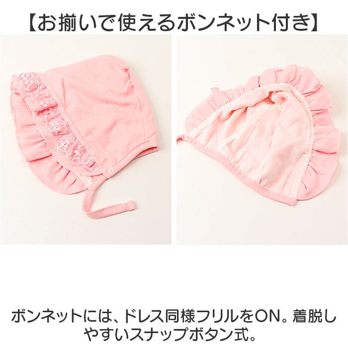 ・ボンネットには、ドレス同様フリルをON。着脱しやすいスナップボタン式。