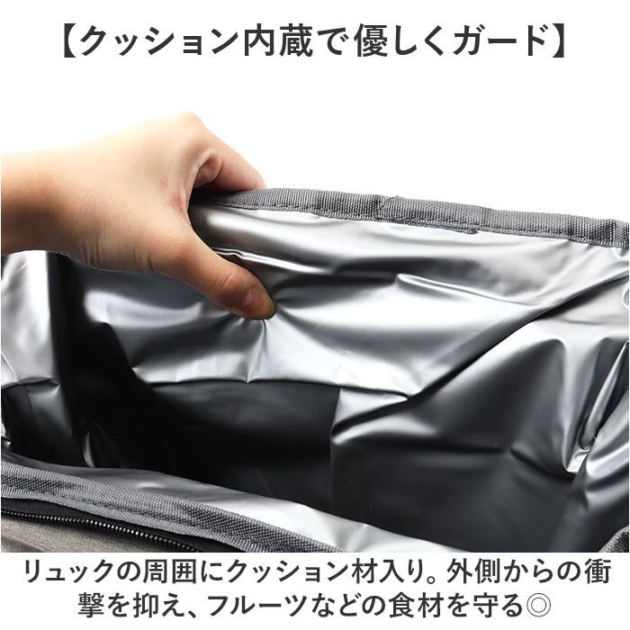 ・リュックの周囲にクッション材入り。外側からの衝撃を抑え、フルーツなどの食材を守る◎