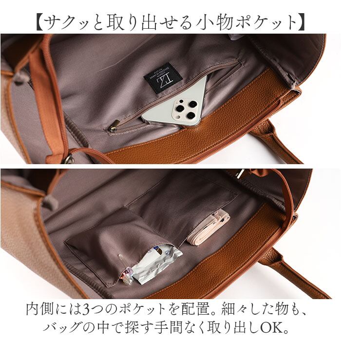 ・内側には3つのポケットを配置。細々した物も、バッグの中で探す手間なく取り出しOK。