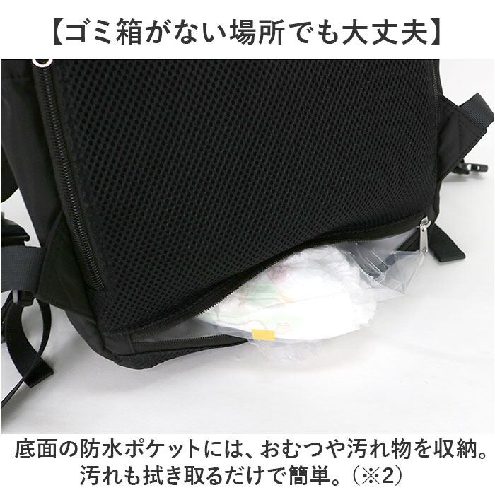 ・底面の防水ポケットには、おむつや汚れ物を収納。汚れも拭き取るだけで簡単。