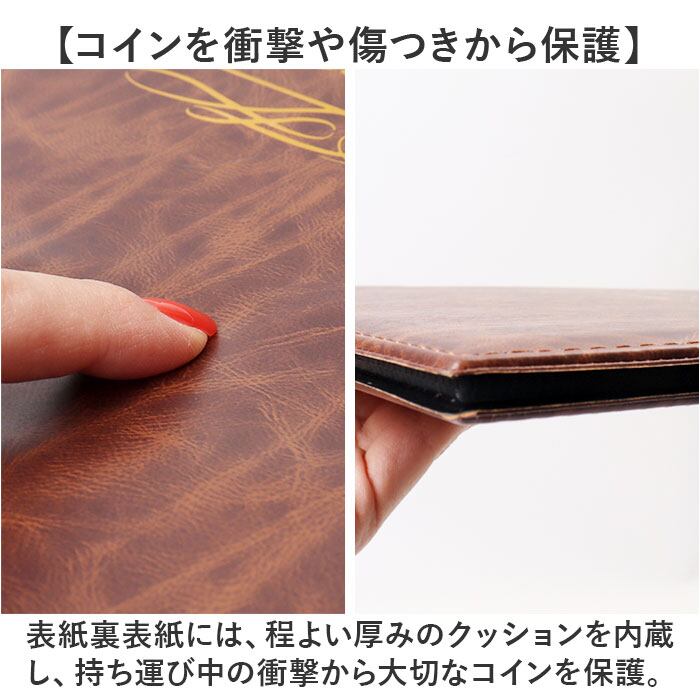 ・表紙裏表紙には、程よい厚みのクッションを内蔵し、持ち運び中の衝撃から大切なコインを保護。