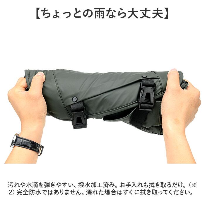 ・2点バックル式フラップ&天ファスナー。中身がこぼれ落ちず、プライバシーも確保。