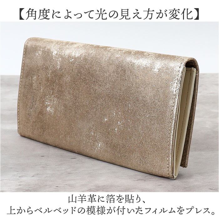 ・山羊革に箔を貼り、上からベルベッドの模様が付いたフィルムをプレス。