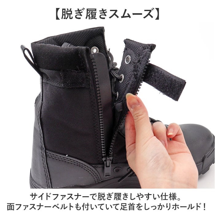 ・サイドファスナーで脱ぎ履きしやすい仕様。面ファスナーベルトも付いていて足首をしっかりホールド!