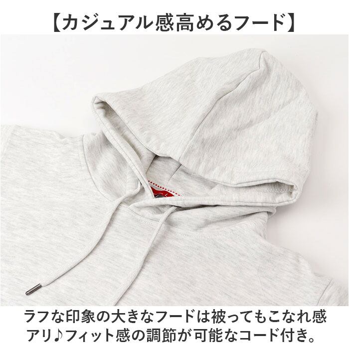 ・ラフな印象の大きなフードは被ってもこなれ感アリ♪フィット感の調節が可能なコード付き。