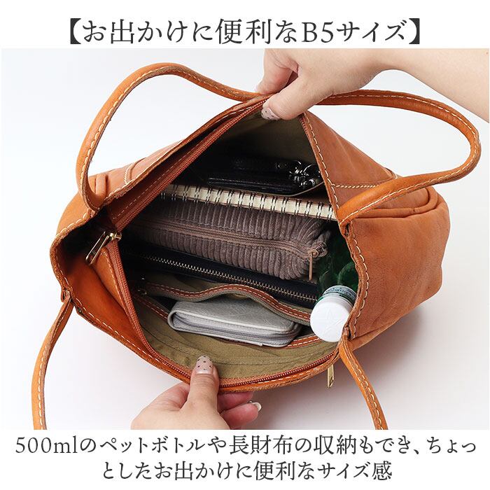 ・500mlのペットボトルや長財布の収納もでき、ちょっとしたお出かけに便利なサイズ感