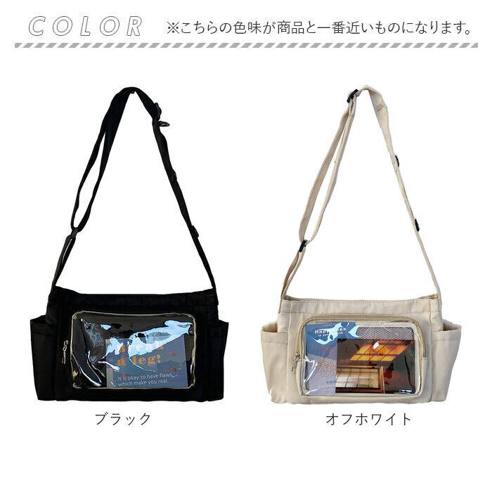 ・バッグの前面は大きなクリア窓。バッジやピンを挿せるデコ板つき◎自由にデコレーション!