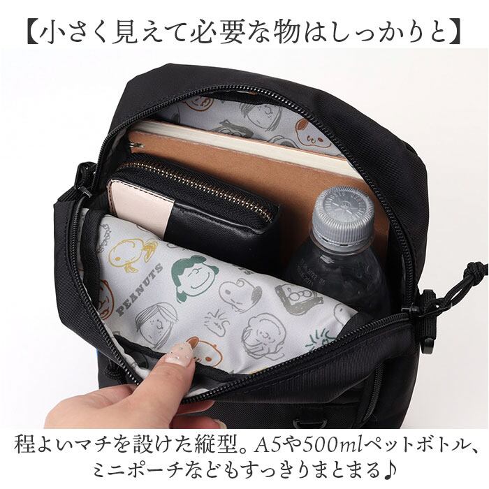 ・程よいマチを設けた縦型。A5や500mlペットボトル、ミニポーチなどもすっきりまとまる♪