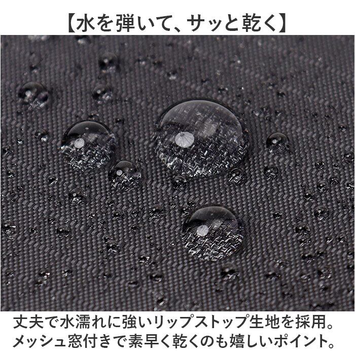 ・丈夫で水濡れに強いリップストップ生地を採用。メッシュ窓付きで素早く乾くのも嬉しいポイント。