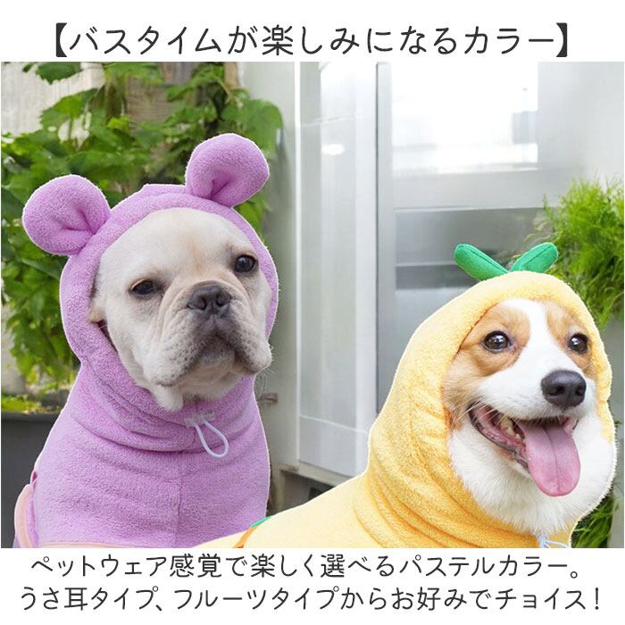 ・濡れたお耳や頭をふわっと包めるフード付き。ちょこんと可愛いうさ耳&フルーツの葉っぱがポイント!