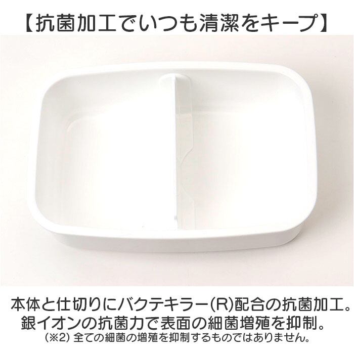 ・本体と仕切りにバクテキラー(R)配合の抗菌加工。銀イオンの抗菌力で表面の細菌増殖を抑制。