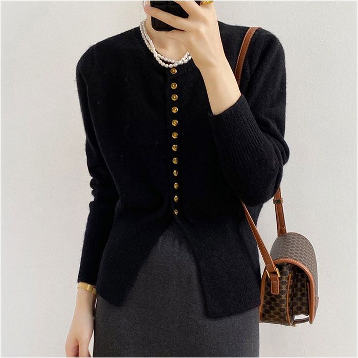 ・フロントのゴールドボタンはアクセサリーのように華やかで華奢な印象。可憐に着れる1枚。