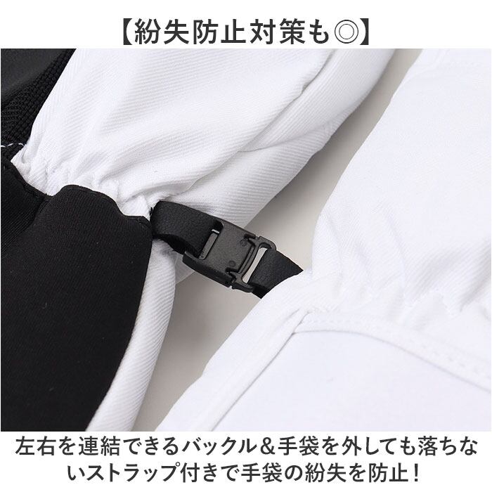 ・左右を連結できるバックル&手袋を外しても落ちないストラップ付きで手袋の紛失を防止!