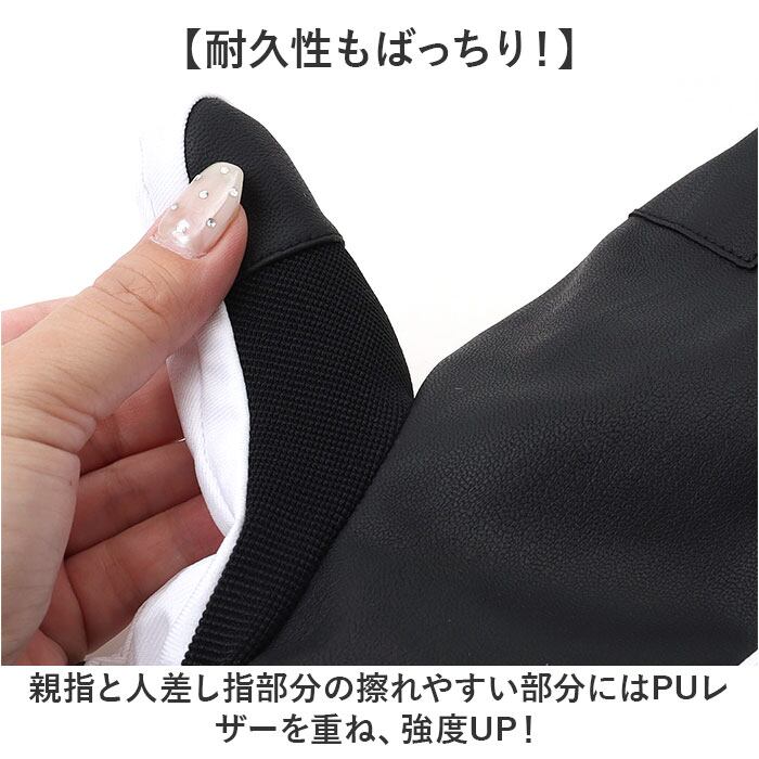 ・親指と人差し指部分の擦れやすい部分にはPUレザーを重ね、強度UP!