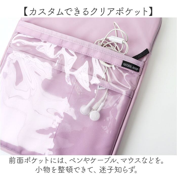・前面ポケットには、ペンやケーブル、マウスなどを。小物を整頓できて、迷子知らず。