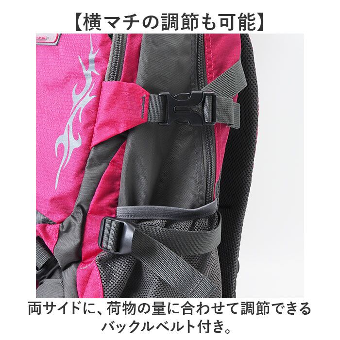 ・両サイドに、荷物の量に合わせて調節できるバックルベルト付き。