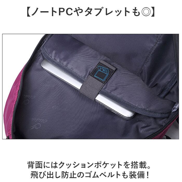 ・背面にはクッションポケットを搭載。飛び出し防止のゴムベルトも装備!