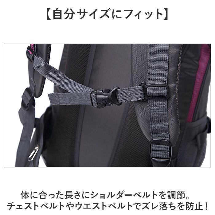 ・体に合った長さにショルダーベルトを調節。チェストベルトやウエストベルトでズレ落ちを防止!
